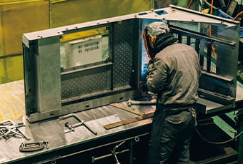 フレームは、重機の骨格に相当します。フレームは鋳造加工またはプレス加工で作成した数点の部品でできており、これを溶接で接合して製造します。ショベルカーなどのように上部が旋回する重機の場合、上部旋回体には「レボフレーム(アッパーフレーム)」、下部走行体には「トラックフレーム(ロワーフレーム)」があり、その間に「旋回フレーム」といわれるフレームがあります。また、アームにもフレームがあり、母材強度や板厚、溶接継手の開先形状などは最適な種類が選択されます。