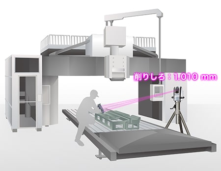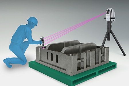 しかし、大型の鋳造部品を門型の三次元測定機で測定するには、加工機から部品を取り外して測定室に移動させるという大変な作業が必要です。また、門型の三次元測定機やアーム型の三次元測定機では測定サイズに限界があるため、製缶した大型部品となると、そもそも測定することができません。他の手段で測定する場合でも、ハンドツールや加工機の機上測定機能では非常に長い時間を要するため、加工機の稼働率を低下させてしまうという問題があります。