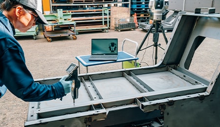 重機部品では、完成品はもちろん、製造中の加工精度や部品交換時の組み付け精度の確認も重要です。従来、これらの測定はダイヤルゲージやコンベックス、長尺ノギスなどハンドツールで行っていました。個別の構成パーツのサイズも大型であることが多く、どうしても2、3人がかりで測定するケースが一般的です。しかも、測定者による測定値のバラつきや、ひずみの傾向などがわかりにくく、測定に時間がかかるといった課題がありました。