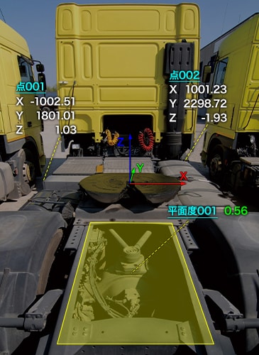 大型のフレームに組み付けたキングピンの組み付け角度や位置の精度は、後輪との軸距で測定します。大型のセミトレーラーの場合、軸距は数メートルに達するため、水糸などを用いて複数人で測定し、角度は水平器などで測定します。しかし、これらハンドツールの場合、当てる角度や強さによって測定値が変わるため、作業者による測定値のバラつきが発生します。