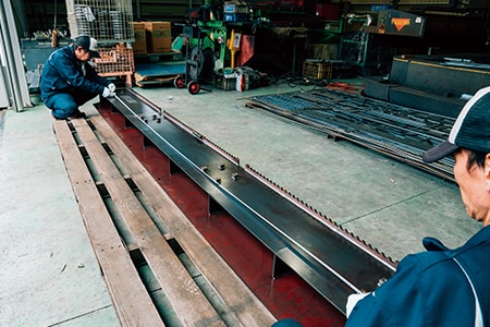 ダイヤルゲージやコンベックスによる寸法測定には2人以上の作業者が必要で、実施のたびに値が異なるため、正確な測定は困難です。また、面角度や倒れの精度は直角ゲージや門型三次元測定機で行ってきました。しかし、門型三次元測定機による測定ではフランジを測定室に移動しなければならず、加工機への脱着などに工数がかかるなど、多くの問題を抱えています。さらに、仕上がり精度を確認しながら追い込みの加工をしていく場合、加工機から降ろしての測定は好ましくなく、加工機に設置した状態での寸法測定が望まれます。このため大型のフランジの寸法測定では、場所を取らず自由に移動ができ、加工機上で広範囲を測定できる三次元測定機が理想的です。