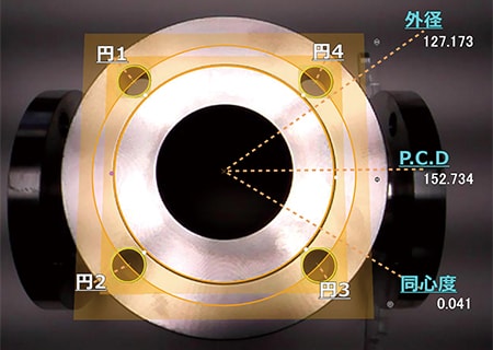 シール面の平面度は、コンベックスや長尺ノギスで複数箇所を測定することで確認します。しかし、この方法の場合、測定を実施していない箇所に寸法不良があった場合は不良を見落としてしまい、正確な確認とはいえません。また、ねじ穴ピッチやPCDは測定箇所が多いため、ハンドツールでは2人以上による長い作業時間が必要です。