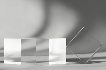 石英ガラスとはガラスの一種で、超高純度の水晶(二酸化ケイ素:SiO2)でできています。通常のガラス(ソーダガラス)に比べて、金属などの不純物がきわめて少ないため、光透過性と耐熱性に優れます。その特長を活かしてレンズ・プリズムなどの光学部品・半導体製造装置部品・半導体・高温チャンバーの窓などの材料に使用されます。