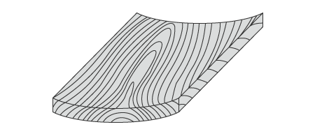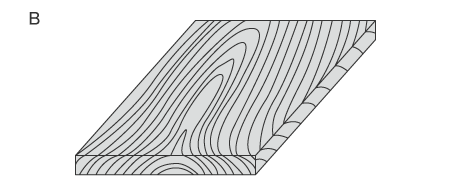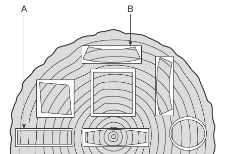 木材は常に呼吸しています。木材内部の含水率は、木材の呼吸により内部の水分が放出と吸収を繰り返されることで変化します。一般に、木材は含水率が高いと伸びて、低いと縮みます。含水率の変化は心材(中心部)と辺材(周辺部)で異なり伸縮に差があります。また、木目の通り方によっても伸縮が異なります。これら伸縮の差が木材の反りやたわみの原因になります。