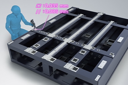 キーエンスのワイドエリア三次元測定機「WM-6000シリーズ」は、ワイヤレスプローブで長さが数メートルにもおよぶ長尺の柱や梁も、高精度測定が可能です。測定範囲内なら製品の奥まった部分にも自由にアプローチでき、1人でもプローブを当てるだけの簡単操作で測定することができます。また、ノギス・コンベックスなどの測定器具に比べて測定結果がバラつくことなく、定量的な測定が可能。測定データとCADデータとの照合や、測定データからCADデータを生成するための機能も備えています。
