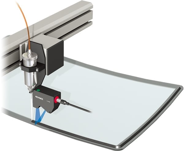 - ガラスパネルのシール材をカメラで検査しています。塗布切れの検査はできていましたが、シール材の倒れを検査する必要が出てきたため、キーエンスの2次元レーザ変位計LJシリーズを導入しました。ディスペンサにセンサヘッドを固定することで、塗布切れの他、厚みや幅、断面積などを測定することができました。