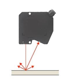 レーザ変位計で対象物を測定するためには対象物からの反射光を受光部で取得する必要があります。三角測距方式の測定器では、反射光を適切に受光できるように対象物の表面状態によってセンサヘッドを傾けて設置します。