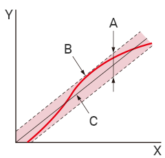 直線性は測定器の性能を表す指標です。理想値と実際の測定結果との誤差の最大値を表します。たとえば直線性が±5μmの測定器を使用して対象物を1㎜移動したとき、表示される値は±5μmの誤差が含まれる可能性があることを意味しています(0.995mm~1.005mm)。