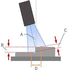 対象物に対して2次元レーザ変位計の光軸が垂直に当たっていない場合、段差の値は図4のように傾きθによる測定誤差が生じます。