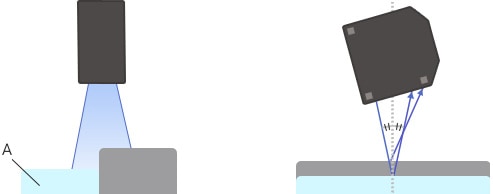 段差測定面の少なくとも一方が透明体または鏡面体である場合、図5のように対象物に対して、投受光角αの半分だけセンサヘッドを傾けて設置します。