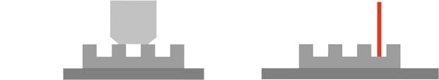 非接触のレーザ変位計の場合、一般的に測定スポットは接触式よりも小さい(数um~数100um)ので、より狭い凹部の底面高さを正確に測ることができます。