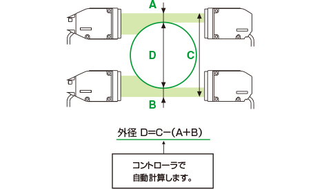 2台のセンサヘッドを使用し、ワークを挟み込むことで外径を測定します。