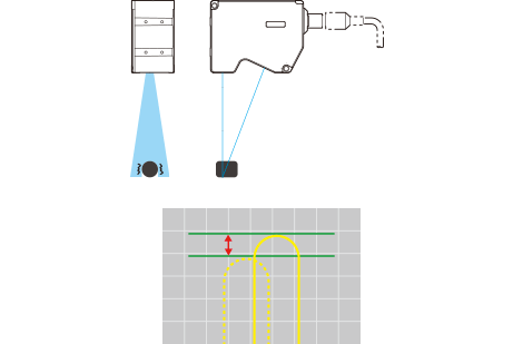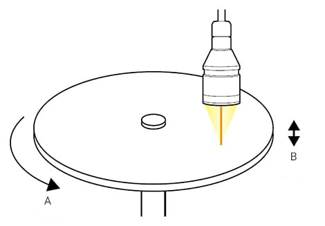 ラインレーザを照射し、得られた形状から特徴点(ピーク点など)の高さを検出し、振れ量を測定します。