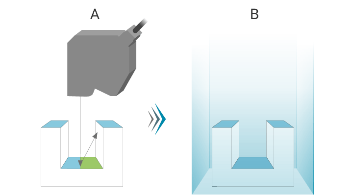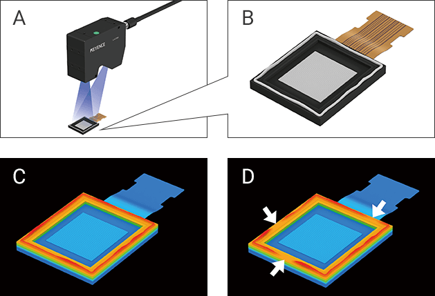 また、部品パッケージのように奥行のあるワークに対しても、上面からワンショットで面(エリア)の高さを測定するため、従来の「点」で測定する変位計のような反射光の遮断、つまり「死角」による測定不可領域が発生しません。