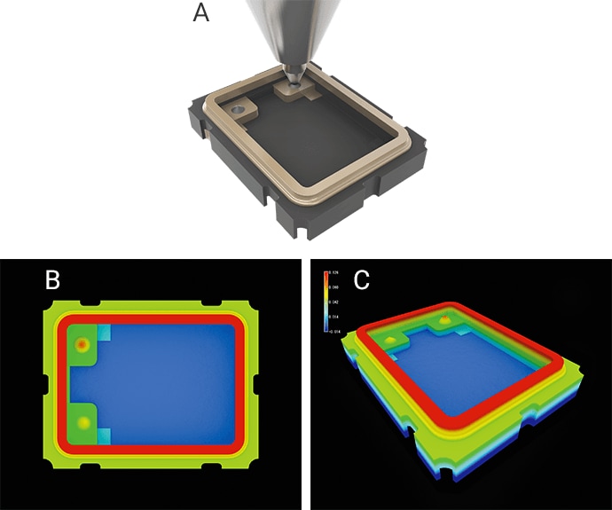 - B. 3次元測定結果(NG例:接着剤の高さピークとバラつきを検出)