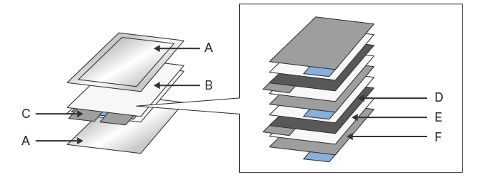 ラミネート型セルの封止・外装に使用するラミネートフィルム(図中A)には、一般的にアルミ箔と樹脂フィルムが用いられます。これらに特殊な接着剤を塗工(塗布)し、ラミネートで貼り合わすことで積層電極と電解液を封止します。ラミネートフィルムに使用する接着剤にはアルミ箔と樹脂フィルムの異種基材に対する強い接着力と、内包する強酸性の電解液への耐性が求められます。