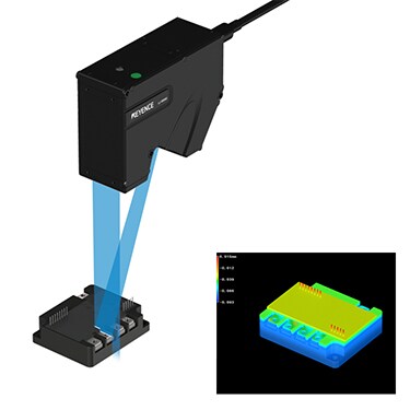 端子高さやピッチのバラツキを検査します。センサヘッドにスキャン機構を内蔵した世界初の商品で、インデックステーブルによる搬送工程でも対象物のわずかな停止時間で検査可能。既存設備につけるだけで簡単に導入できます。