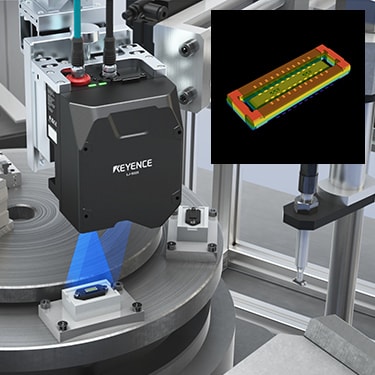 端子高さやピッチのバラツキを検査します。センサヘッドにスキャン機構を内蔵した世界初の商品で、インデックステーブルによる搬送工程でも対象物のわずかな停止時間で検査可能。既存設備につけるだけで簡単に導入できます。