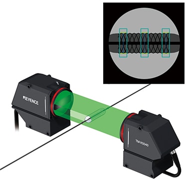 ガイドワイヤーは複雑な形状が多く、かつ精度も求められるため、測定に非常に時間がかかっていました。特に先端部の形状は性能に影響する部分であるため、その加工精度が重要です。外径だけでなく、高速エンコーダ同期入力を使用することで形状測定にも対応します。最小検出能力10μmの極細モードにより先端形状も正確に測定できます。また、対象物を回転させることで真円度、同軸度の測定も一台で行うことが可能です。