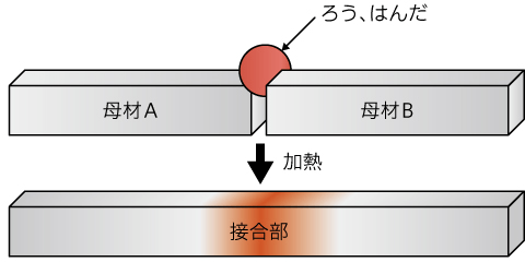 母材より溶ける温度(融点)が低い溶加材(ろう材)を使用し、接合する方法です。母材を溶かさず接合させると同時に、母材との良好な接合状態を得るために、ろう材にはフラックスが配合されています。