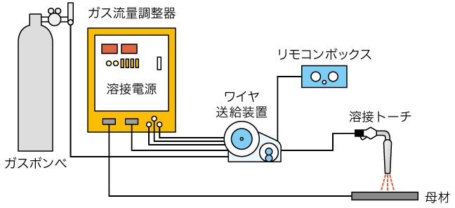 電極には、針金状の溶接ワイヤを使用します。ワイヤはコイル状に巻かれてワイヤ送給装置に取り付けられており、電動モータで駆動する送給ローラで自動的にトーチの先端部まで送給されます。ワイヤへの通電は、コンタクトチップ通過時に行われます。ワイヤと母材との間に発生させたアークで、ワイヤと母材を同時に溶かしながら溶接します。このとき、アークや溶融地の周辺を大気からシールドするシールドガスは、ノズルで溶接部周辺に供給されます。
