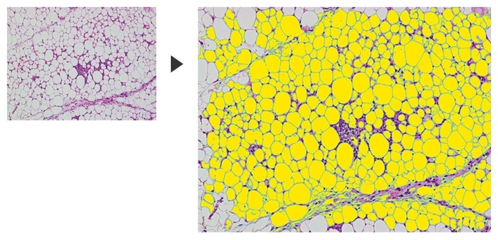 - ハイブリッドセルカウントを使用して、隣接する脂肪細胞のひとつひとつを抽出し、カウントすることができます。