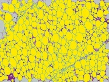 脂肪細胞は、細胞質に脂肪滴と呼ばれる脂肪のかたまりをもっている細胞で、単胞性脂肪細胞(白色脂肪細胞)と多胞性脂肪細胞(褐色脂肪細胞)に分かれます。白色脂肪細胞には大きな脂肪滴がひとつあり、脂肪をたくわえる役割をしています。褐色脂肪細胞には中小の脂肪滴が多数あり、脂肪を燃焼して熱を産生します。