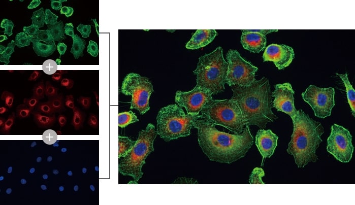 - 多重染色された細胞も、各蛍光チャンネルの画像を4つまで重ね合わせて、1枚のオーバーレイ画像を撮影することができます。