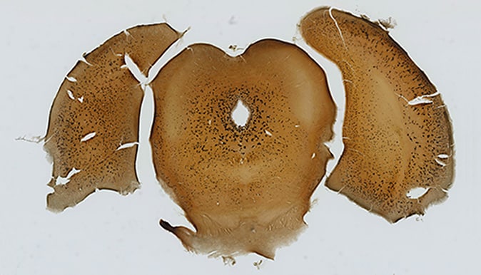 脳は神経細胞それぞれが軸索をのばし、他の膨大な数の神経細胞がシナプスで互いに結合したネットワークによって、記憶や情動などの高次元機能を実現しています。実験や研究には動物の脳が用いられ、ゴルジ染色プロトコールに沿って温度管理しながらクライオスタットで複数の均等な厚みの切片にスライスし、染色のプロセスを経て複数の標本を作製して観察します。