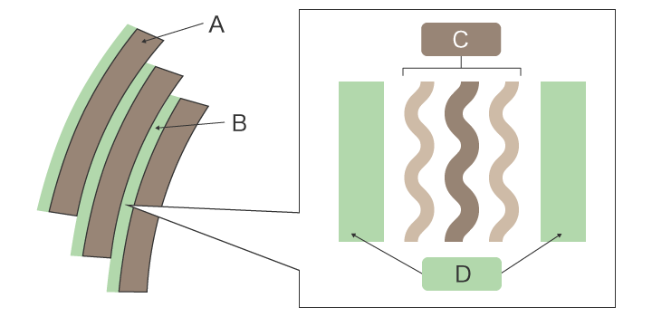 コルテックスはマクロフィブリルの集まりです。マクロフィブリルはミクロフィブリルが集まってできており、ミクロフィブリルとミクロフィブリルのすき間には、親水性で保湿性があるマトリクス(間充物質)があります。マトリクスの主成分は非結晶性ケラチンです。メラニン色素を多く含み、他にアミノ酸やPPT(ポリペプチド)・核酸・ミネラルなどが混在します。パーマネントによるウェーブやヘアカラーで染色されるのはマトリクスであるため、ヘアケアでは重要な部分です。