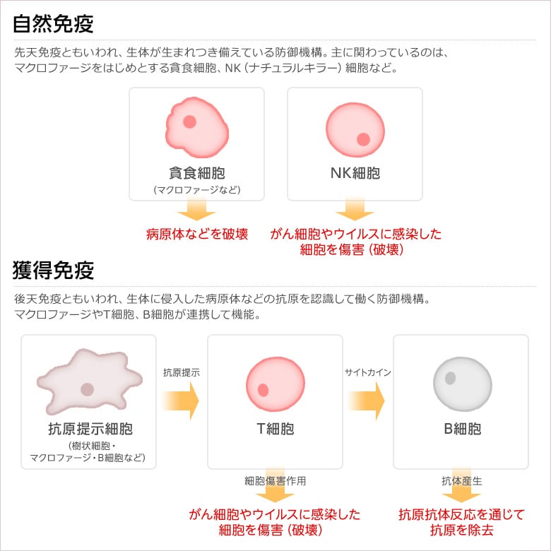 後者は免疫機能が体内に侵入した細菌やウイルスを認識し、その情報を記憶することで、次回の侵入に対する抵抗性を備える。免疫に関係する細胞としては、抗原を食べてその情報を提示するマクロファージをはじめ、抗体を作りだす細胞の元であるB細胞、マクロファージから情報を元にB細胞への指令を出すT細胞などがある。