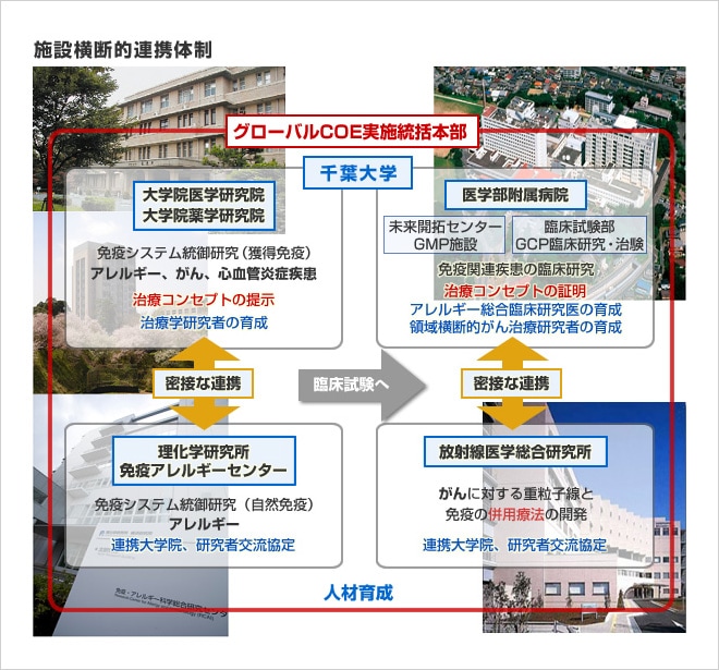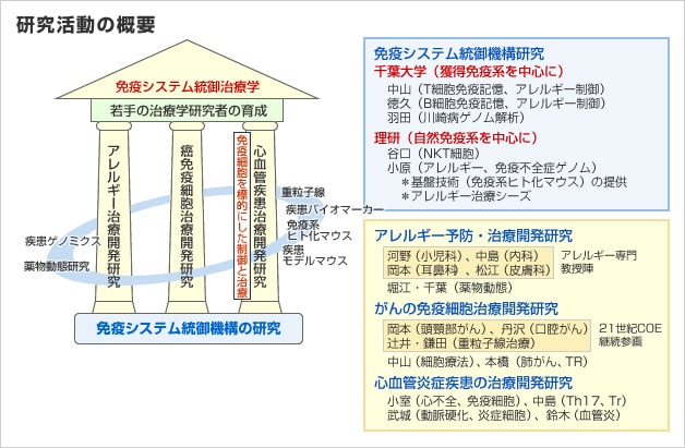 各組織の役割を見ると、千葉大学の両研究院が獲得免疫に基づく治療学の研究を手がける一方、理化学研究所では自然免疫に基づく治療学を展開している。従来、免疫の研究といえば、獲得免疫が中心であったが、近年は自然免疫の重要性が再認識されている。千葉大学と理化学研究所は密接に連携することで、双方の免疫システムを踏まえた先進的な治療法を研究している。