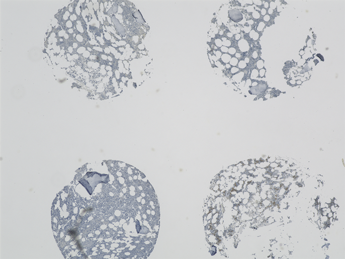 この研究グループ独自の成果として、特別に開発したMDSの骨髄パンチ生検のTMA(組織マイクロアレイ)がある。このTMAには、AML(急性骨髄性白血病)患者の生検と正常対照者の生検が含まれており、直接比較することができる。TMAに関する免疫組織化学的研究を評価するうえで、蛍光顕微鏡BZシリーズの大きなメリットとしては、TMA上のひとつのサンプル、あるいは複数のサンプルをまとめて1枚の画像に収めることができる点が挙げられる。