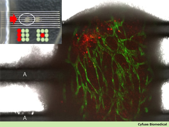 バイオ3Dプリンター・Regenovaでスフェロイドを3×3に積層配置し、6日間循環培養した。スフェロイド同士が融合し、腸管筋線維芽細胞中で血管内皮細胞(緑色)は血管網を形成し、スフェロイドに生着させた転移性直腸がん細胞(赤色)も移動している。黄色部分は、癌細胞が血管内に入り込んでいる。
