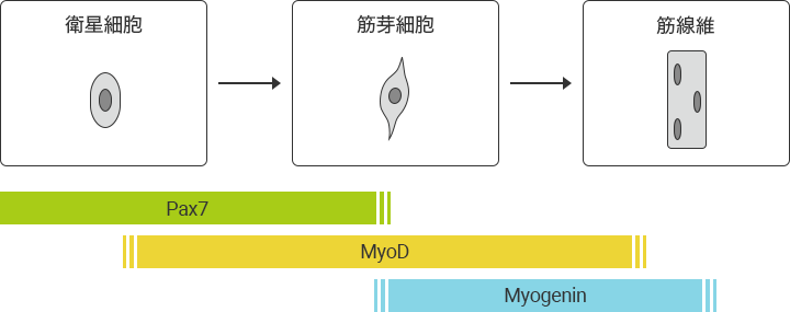 衛星細胞は、Pax7という転写因子を発現しています。筋損傷等で刺激化されると活性化して、筋分化制御因子のMyoDを発現します。活性化した衛星細胞は、修復に必要な筋細胞を供給するために増殖を繰り返します。その後、Pax7を失い、筋分化決定因子のMyogeninを発現することで、筋細胞となり、既存の筋線維と融合します。