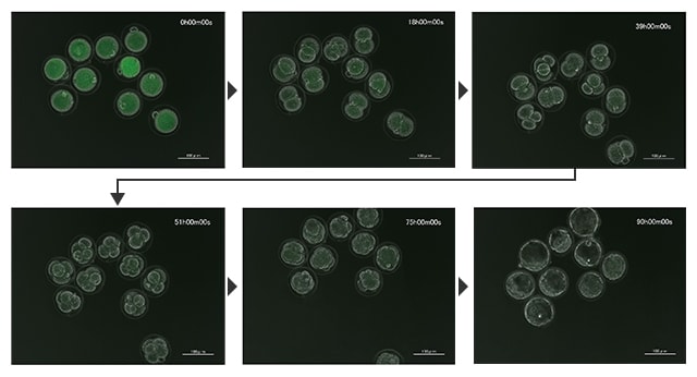 一般に、細胞分裂の過程を観察する際、一定時間ごとに生細胞の蛍光像を撮影する「タイムラプス撮影」が用いられます。実験および撮影を成功させるには、蛍光観察において、生細胞にできる限りダメージを与えないことが重要です。