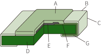 - 抵抗体を内部電極を介して端子電極へ接続します。3層程度の構造になっています。