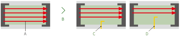 - (2)抵抗体にトリミングを入れることで電流経路が狭くなり、抵抗値が上がる