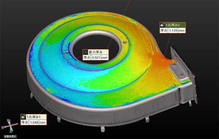 指定した箇所の厚みを自動計算し、差分をカラー表示することが可能です。3色カラー表示でしきい値を設定して検査時のOK/NG判定や、良品と不良品の形状を比較することができます。また、グラデーション表示で試作時の設計データと比較することで厚みの傾向を分析でき、板厚減少や厚み分布の解析が容易に行えます。