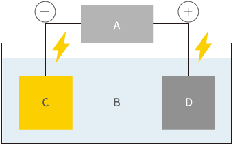 電解研磨液と呼ばれる酸性の液体に対象物を浸漬し、対象物を陽極として電流を流します。対極の表面から微量の鉄やニッケル原子が溶け出し、対象物がエッチングされます。陰極の設置によって狙ったところが削れ、結果として少ないエッチング量で細かい粗度に仕上げることができます。