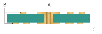 層数から1層基板と呼ばれることもあります。ドリルもしくはパンチングで穴開けするだけで、穴にメッキされないノンスルーホールとなります。コスト低減を目指した大量生産の民生用電子機器に使用されることが多い基板です。