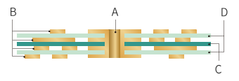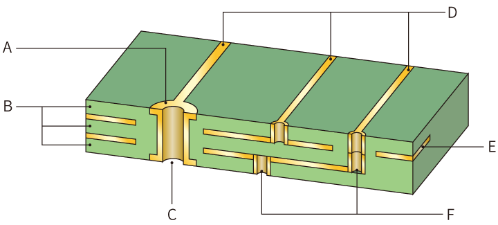 多層基板で、異なる回路層の間を接続する穴は、ビア(via)と呼ばれています。また、スルーホールの周りの電子部品のリードをはんだ付けする部分は、ランド(パッド)と呼ばれています。