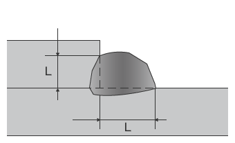 そして、外観からわかる寸法の規定項目としては、接合の付け根部分にあたる溶接ルート部から溶接ビード止端までの最小長さ「脚長(きゃくちょう)」があります。たとえば、すみ肉溶接では下図のように、脚長が薄いほうの母材の板厚の80%以上の長さを満たしているかどうかが、最適なビード幅の判断基準となります。たとえば、薄いほうの母材の板厚が20mmの場合、16mm程度の脚長が必要となり、ビード幅を決定します。脚長の例を以下の図に示します。