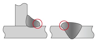 - 溶接速度が低いと、溶着金属量が過剰になり発生します。また、すみ肉溶接で発生する場合は、過剰な溶融金属が重力で垂れ下がり発生します。