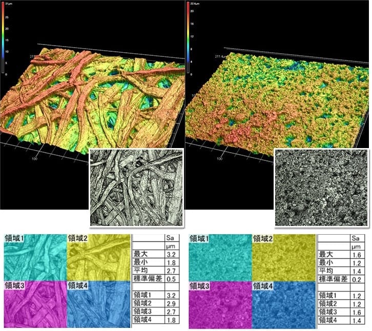 印刷品質に影響を与えるため、表面の平滑性は重要。Raで評価されることが多いが、面全体を捉えるSaで見る事でより確実な評価が可能。製品の面全体が品質を問われる場合は、面での評価が有効。凹凸の周期を見るRSmなども有効とされる。