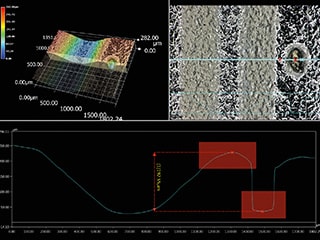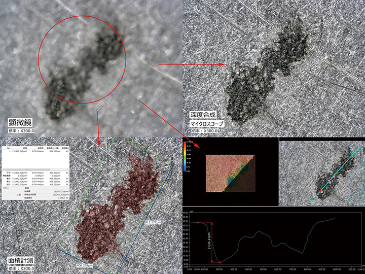 自動面積計測(左下)や3D形状・プロファイル測定(右下)が簡単な操作で実現。