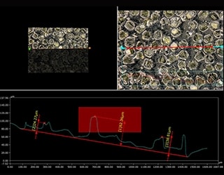 4Kデジタルマイクロスコープ「VHXシリーズ」の「3D合成機能」を使用すると、プロファイル測定ができます。PCD工具の表面形状を把握することができ、欠損はもちろん、摩耗をマイクロメートル単位で測定することも可能です。