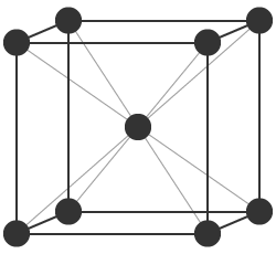 常温の鉄は、立方体の各頂点と中心に原子が位置する「体心立方格子」という形を取っています。