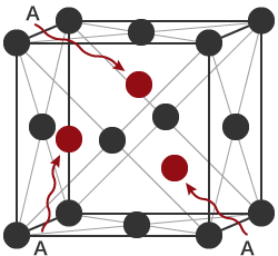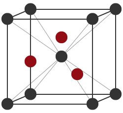 焼き入れを行いますと、鉄は立方体の各頂点と面の中心に原子が位置する「面心立方格子」という形になり、そこに炭素が溶け込みます。
