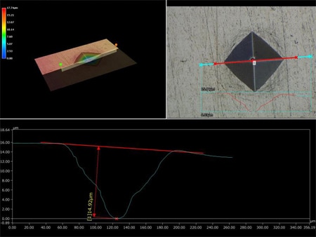 残されたビッカース痕の対角線長さを測定することで算出できます。